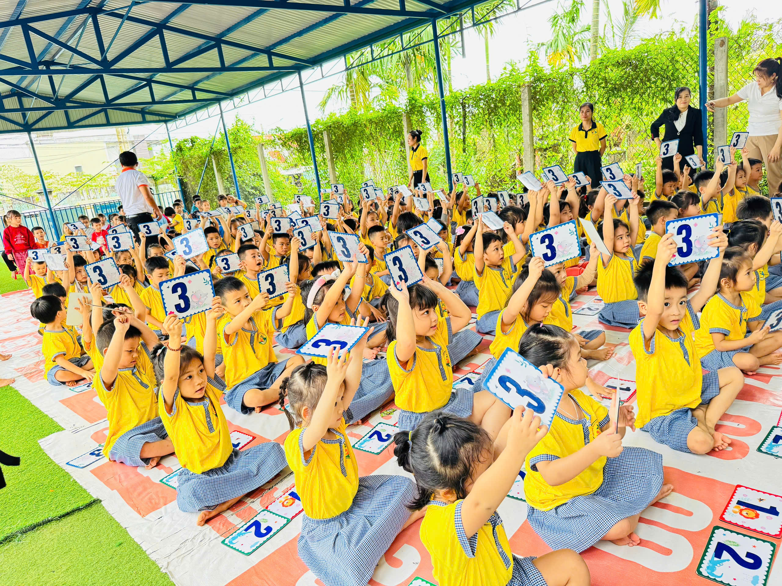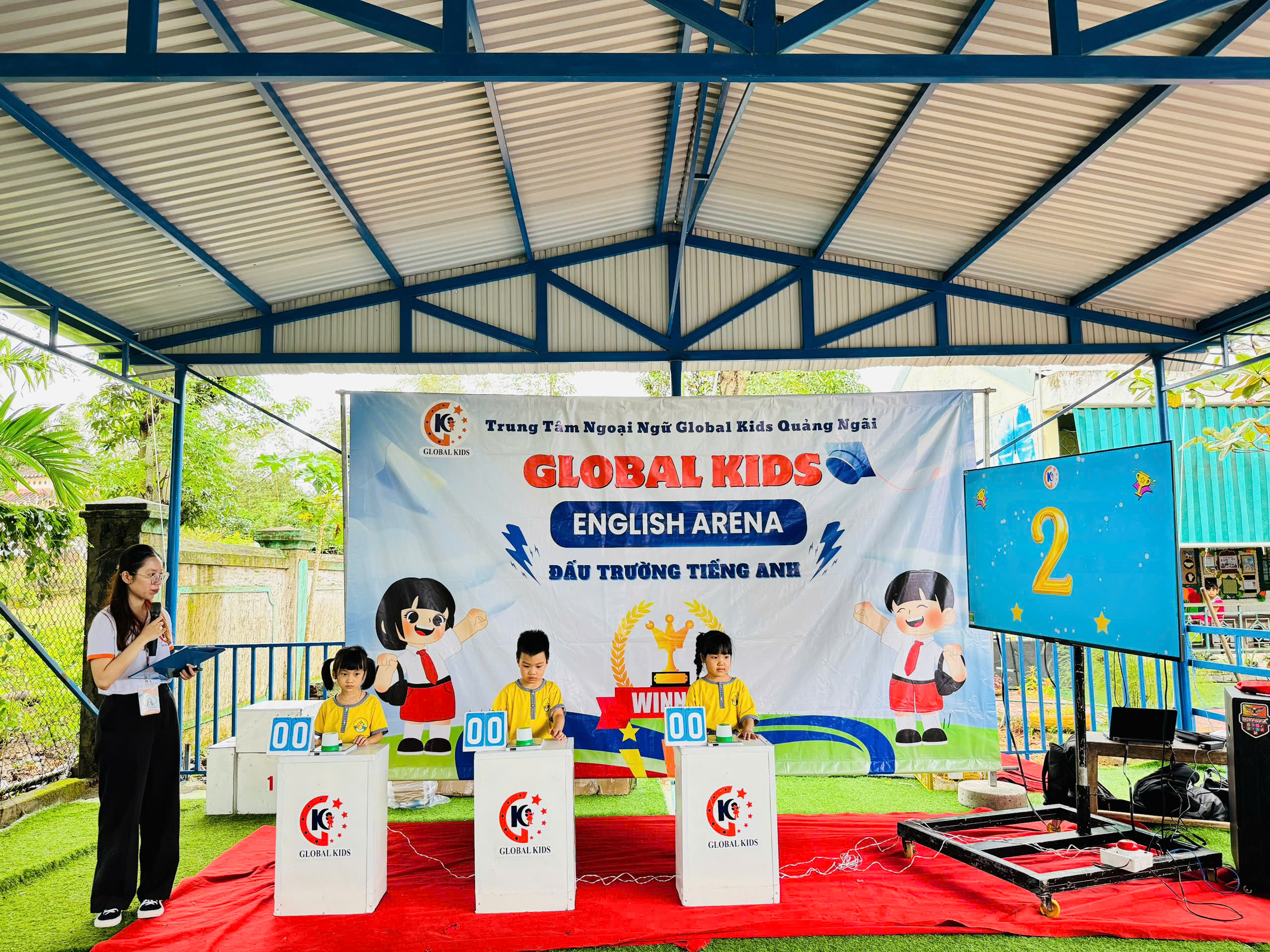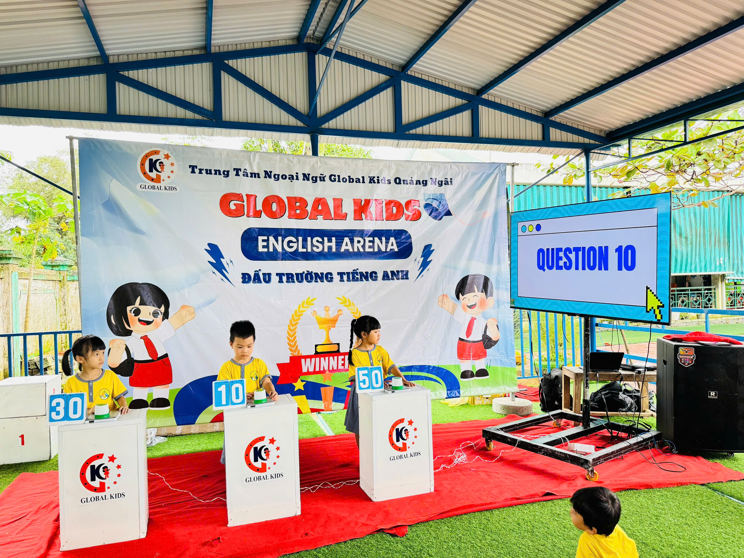Ngay từ những phút đầu tiên, không khí đã trở nên thật náo nhiệt! Các bé hào hứng tham gia, mạnh dạn thể hiện khả năng tiếng Anh của mình trước thầy cô, bạn bè và ba mẹ. Những đôi mắt sáng long lanh, những tiếng cười giòn tan và những cái tay giơ lên thật cao chính là minh chứng cho sự tự tin và niềm vui mà các bé nhận được qua sân chơi này.