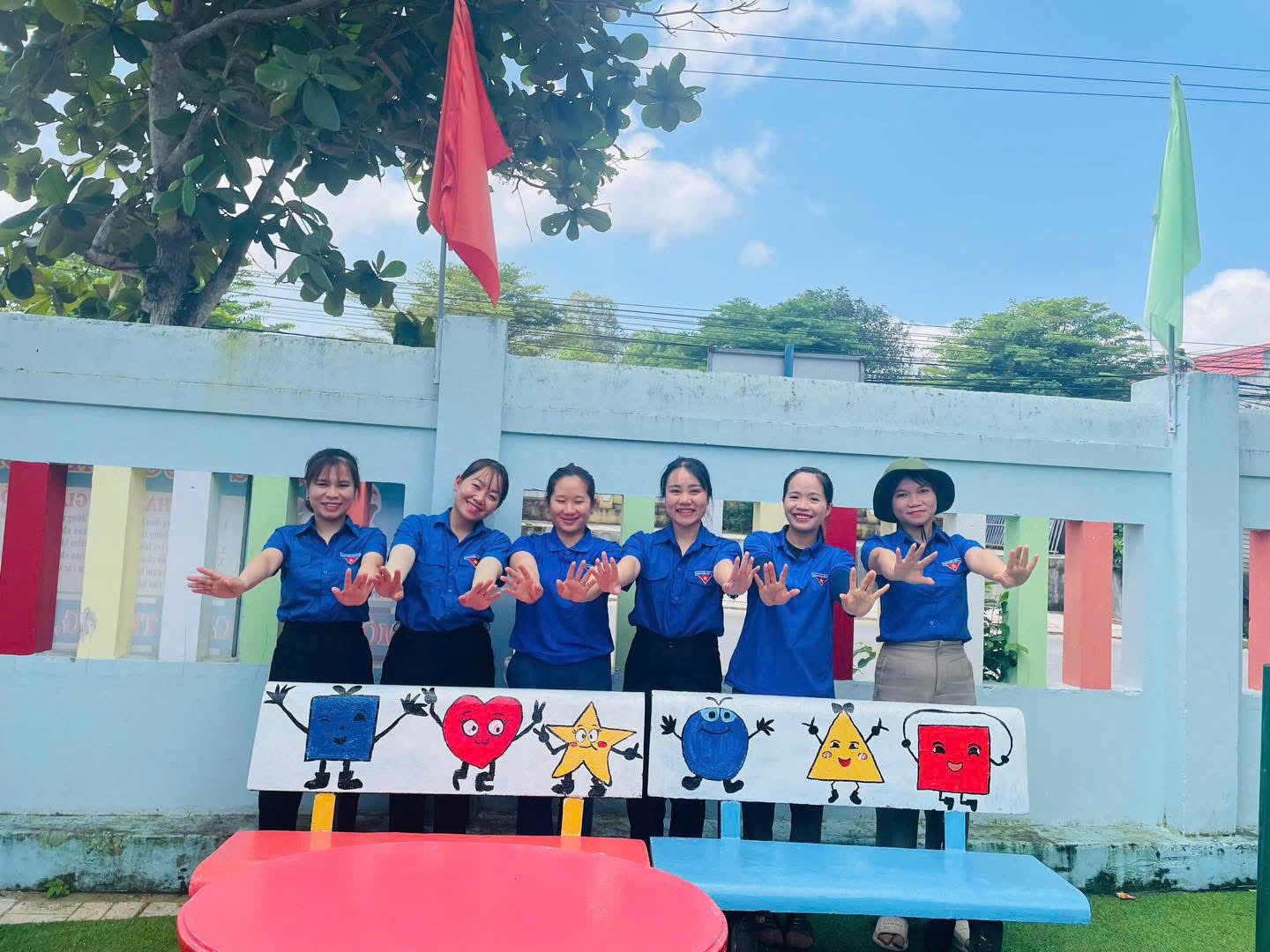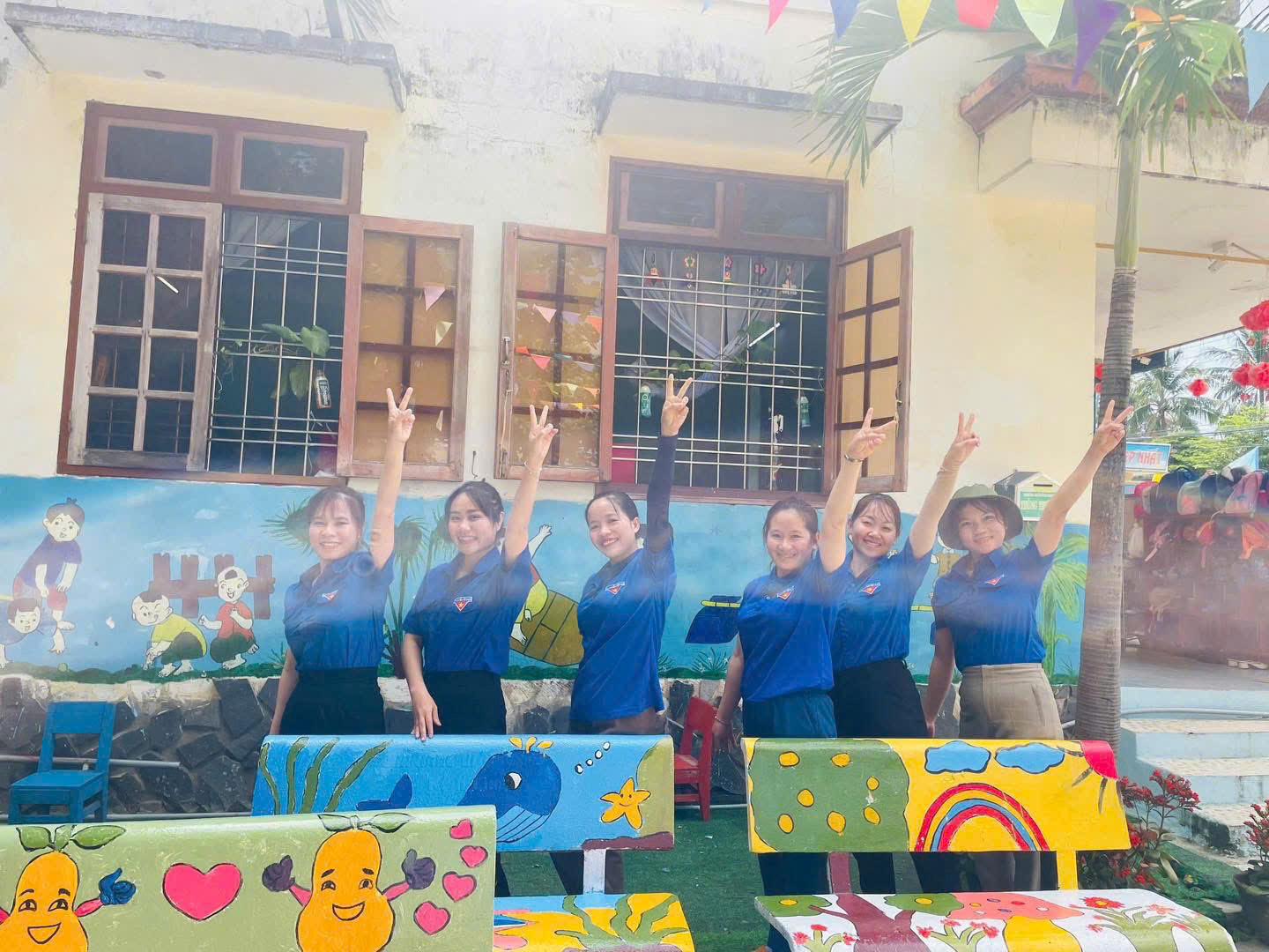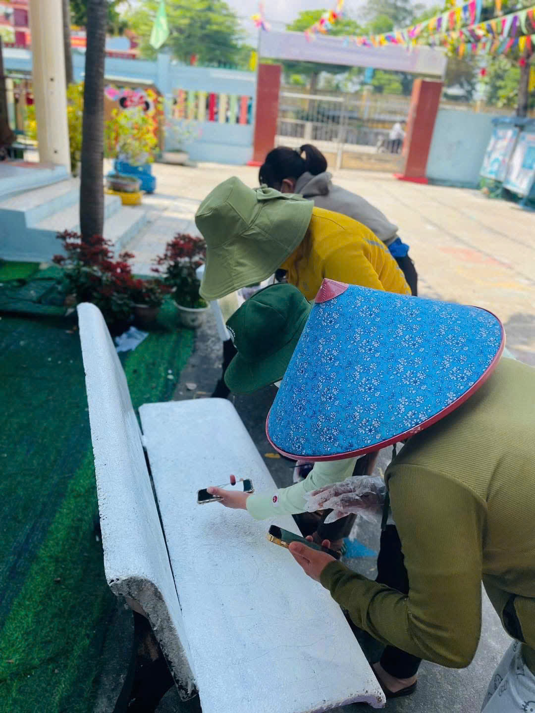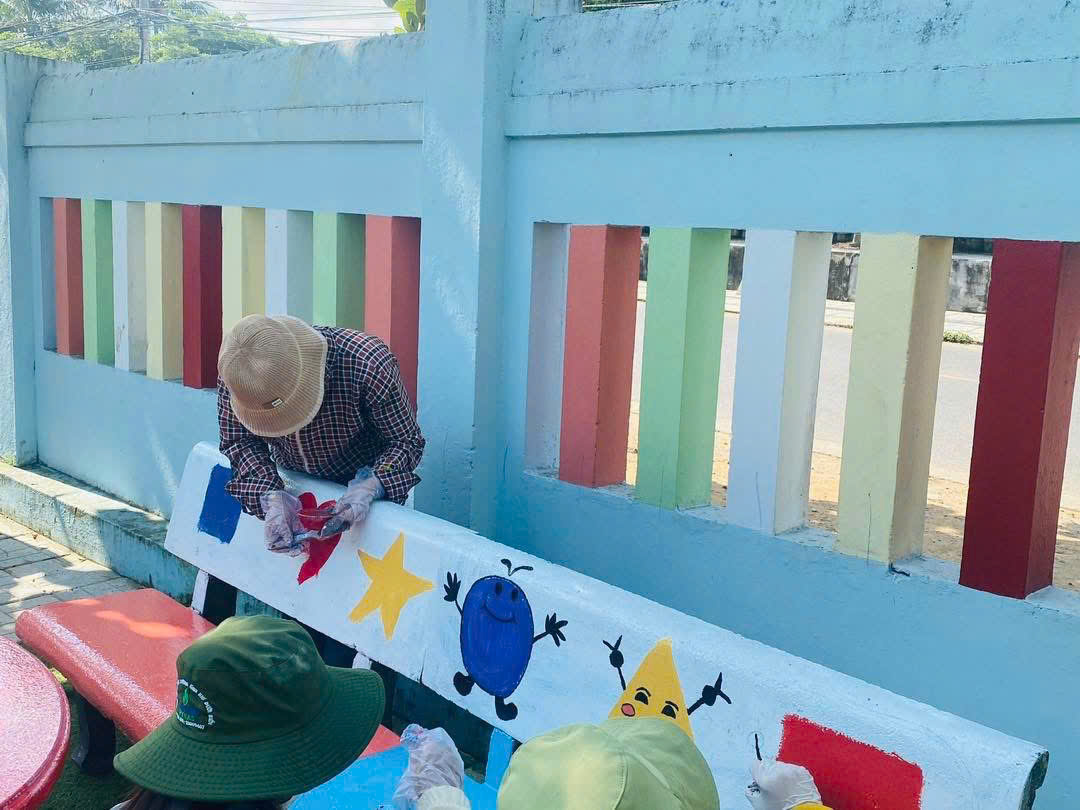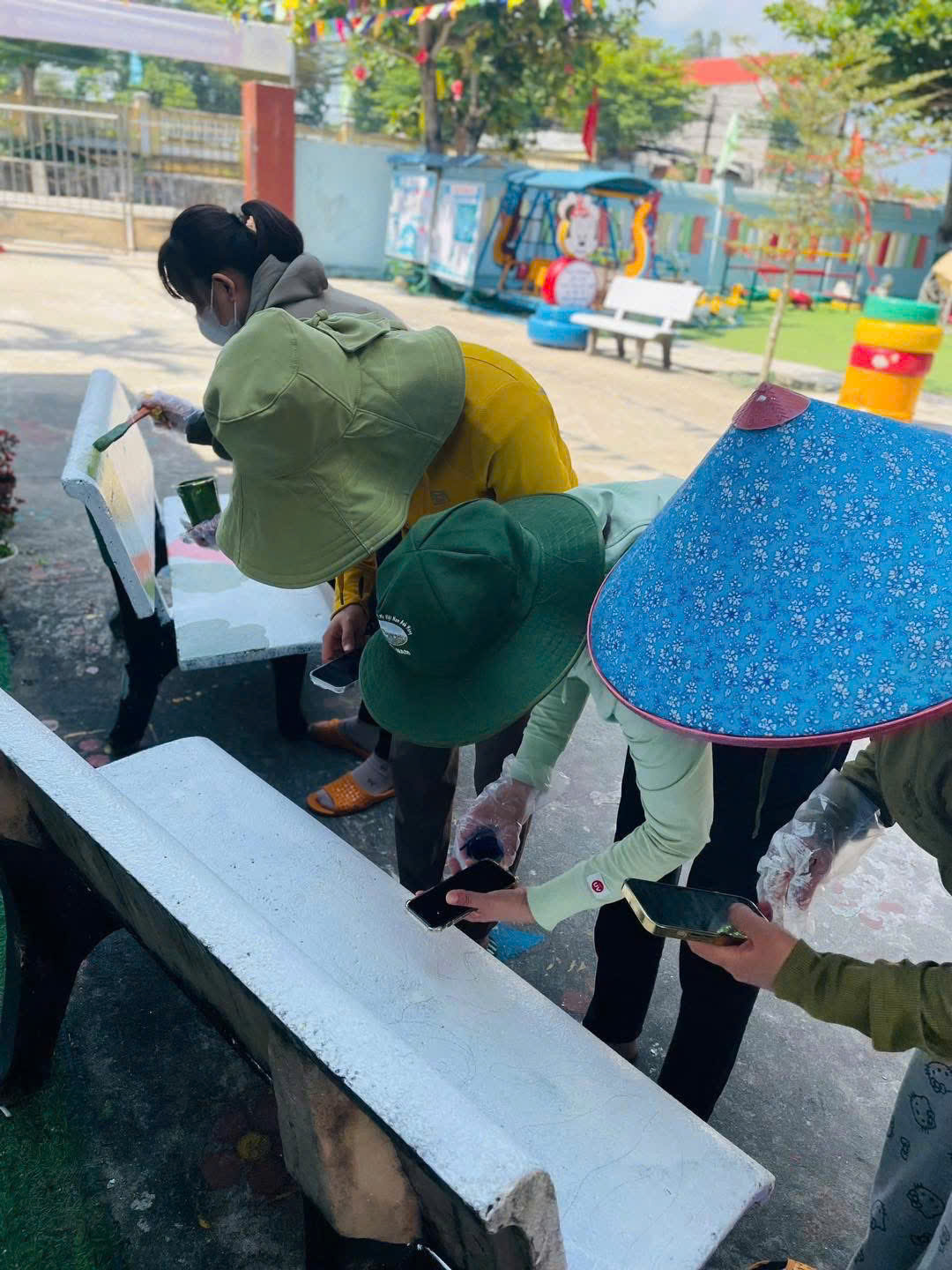 Bên cạnh đó, đoàn viên thanh niên trong chi đoàn đã tích cực tham gia hoạt động sơn vẽ ghế đá trong khuôn viên trường, góp phần tạo cảnh quan xanh – sạch – đẹp, xây dựng môi trường học tập thân thiện, an toàn cho các bé. Những chiếc ghế đá được khoác lên mình màu sắc tươi sáng, sinh động, thể hiện tinh thần đoàn kết, sáng tạo và nhiệt huyết của tuổi trẻ.