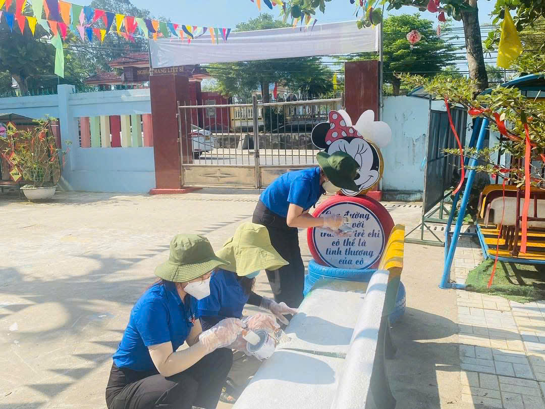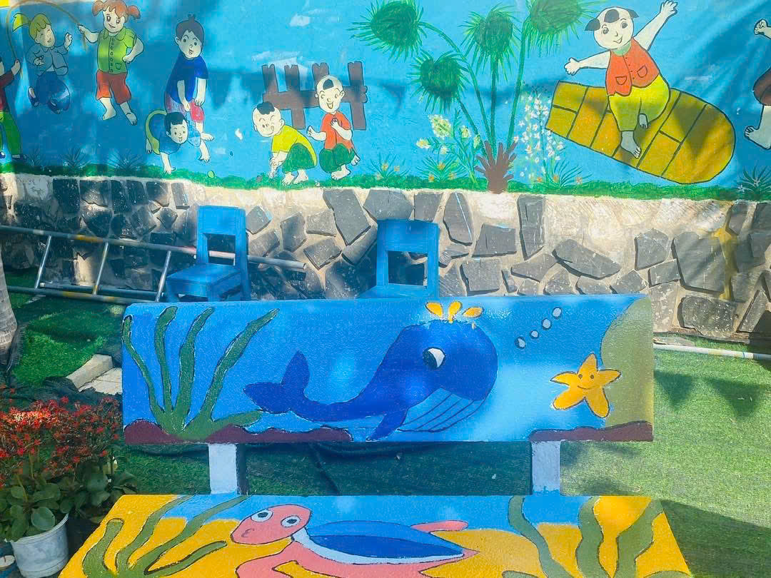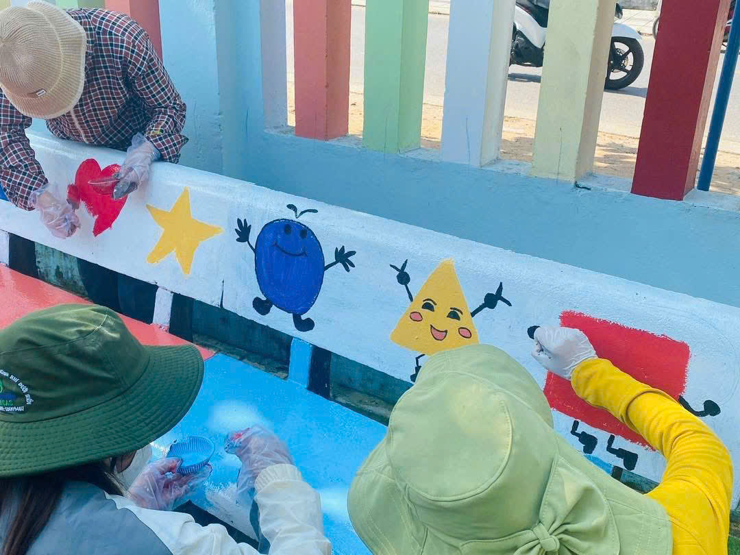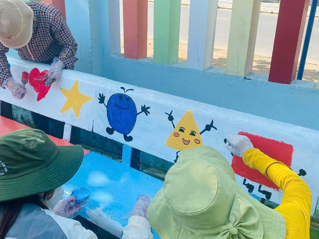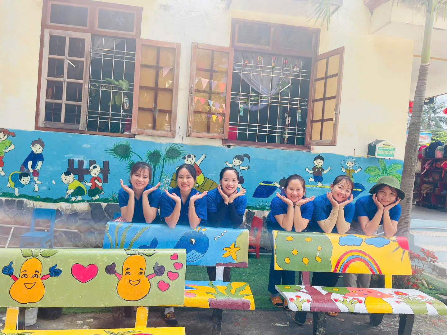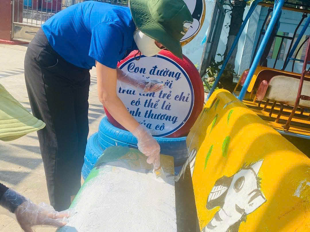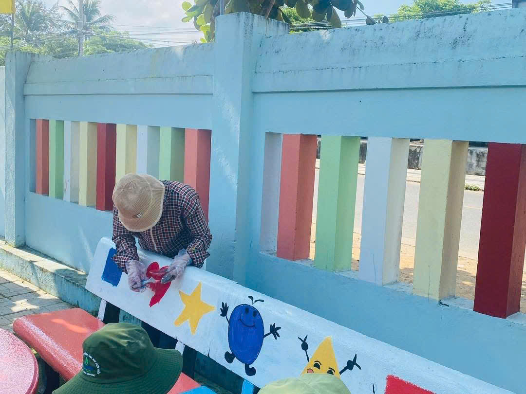 Bên cạnh đó, đoàn viên thanh niên trong chi đoàn đã tích cực tham gia hoạt động sơn vẽ ghế đá trong khuôn viên trường, góp phần tạo cảnh quan xanh – sạch – đẹp, xây dựng môi trường học tập thân thiện, an toàn cho các bé. Những chiếc ghế đá được khoác lên mình màu sắc tươi sáng, sinh động, thể hiện tinh thần đoàn kết, sáng tạo và nhiệt huyết của tuổi trẻ.