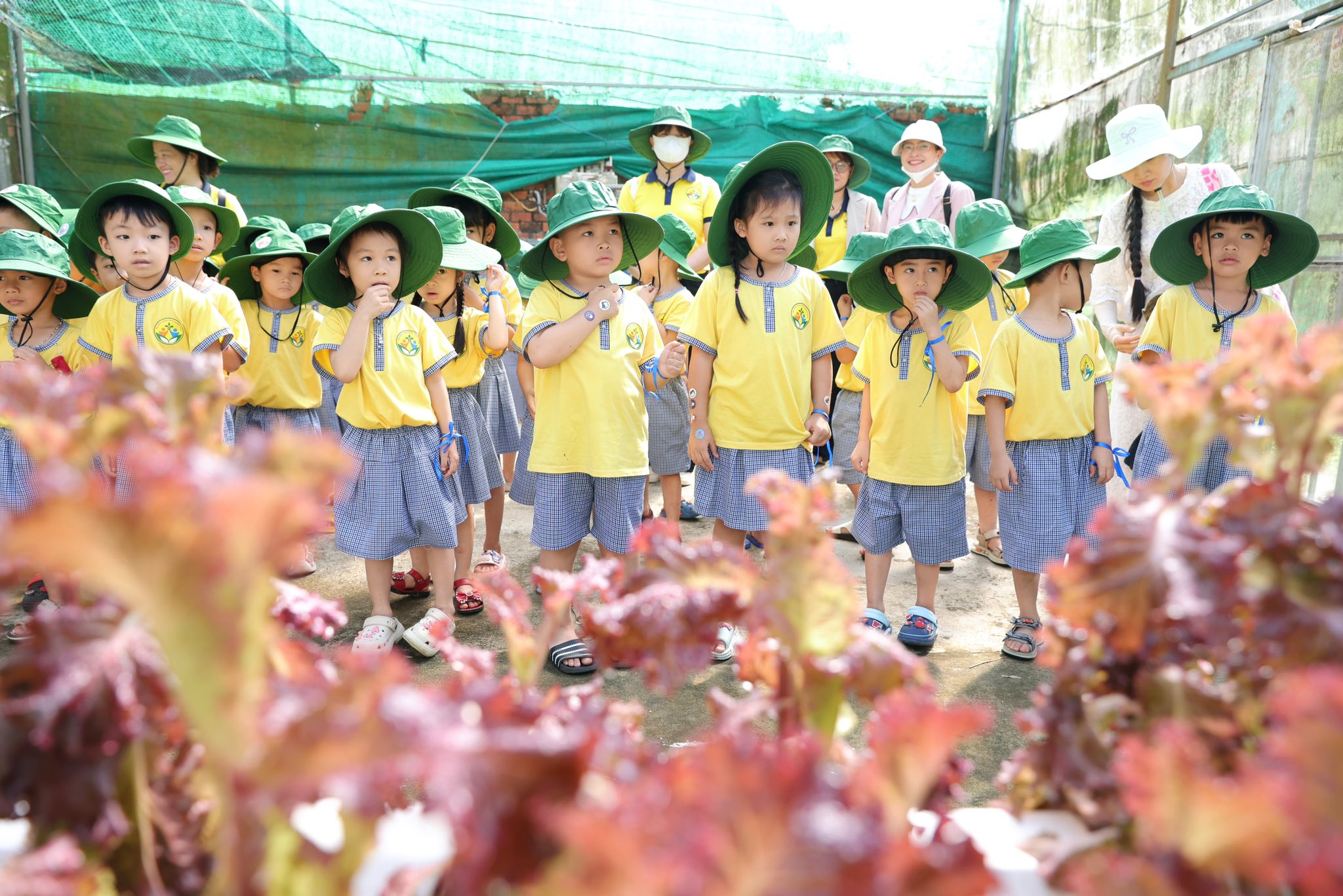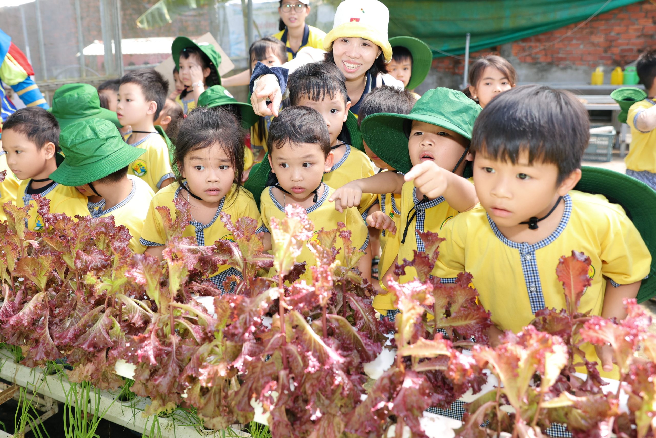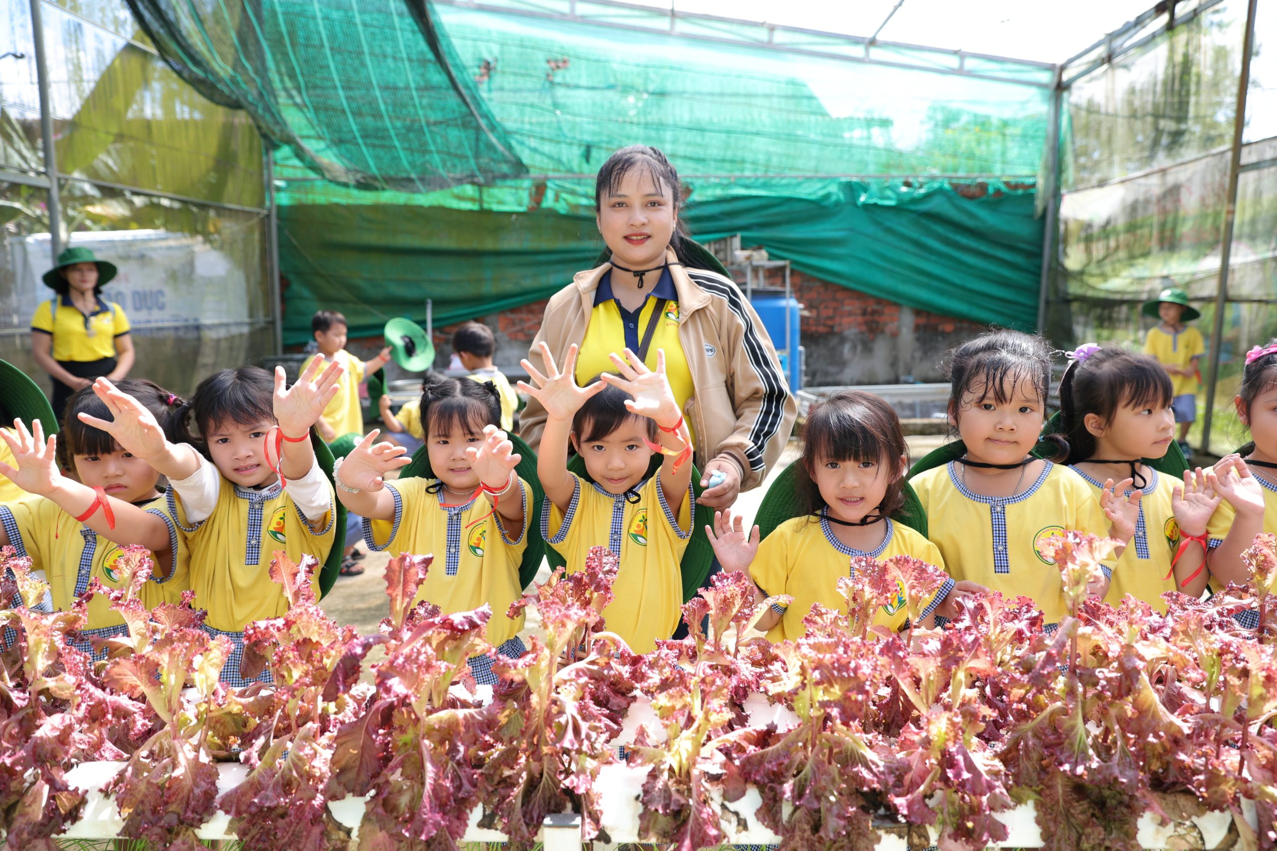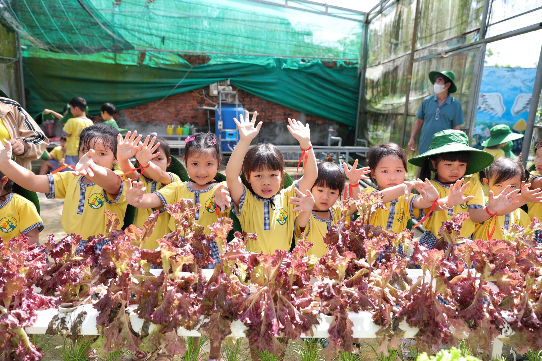Bên cạnh đó, các bé còn được tham gia nhiều hoạt động trải nghiệm thú vị như làm bánh xèo, tráng bánh tráng, tham quan vườn nấm và vườn rau thủy canh. Thông qua những hoạt động này, trẻ không chỉ được khám phá những điều mới mẻ mà còn hiểu thêm về quy trình làm ra các sản phẩm quen thuộc trong cuộc sống hằng ngày.