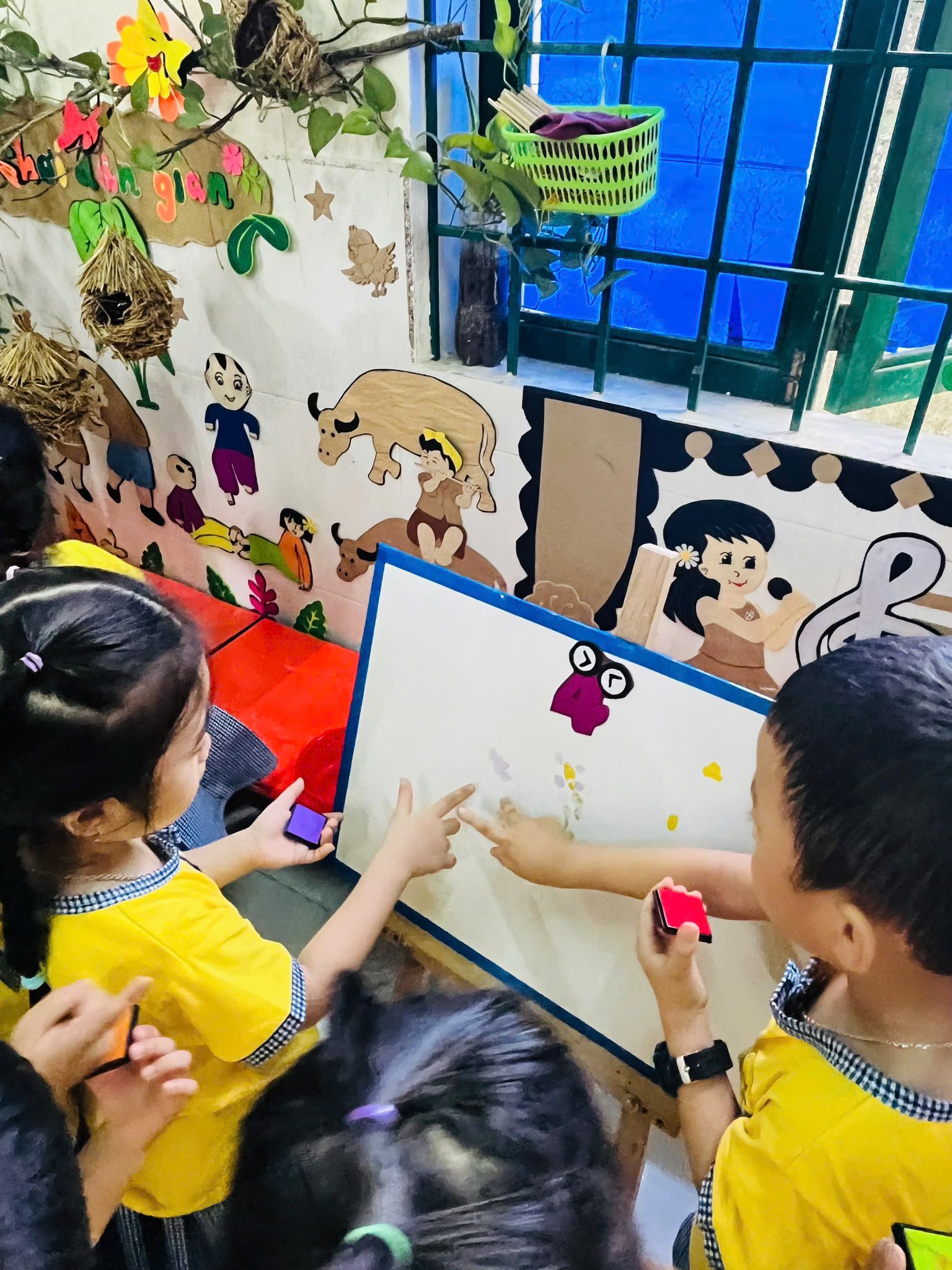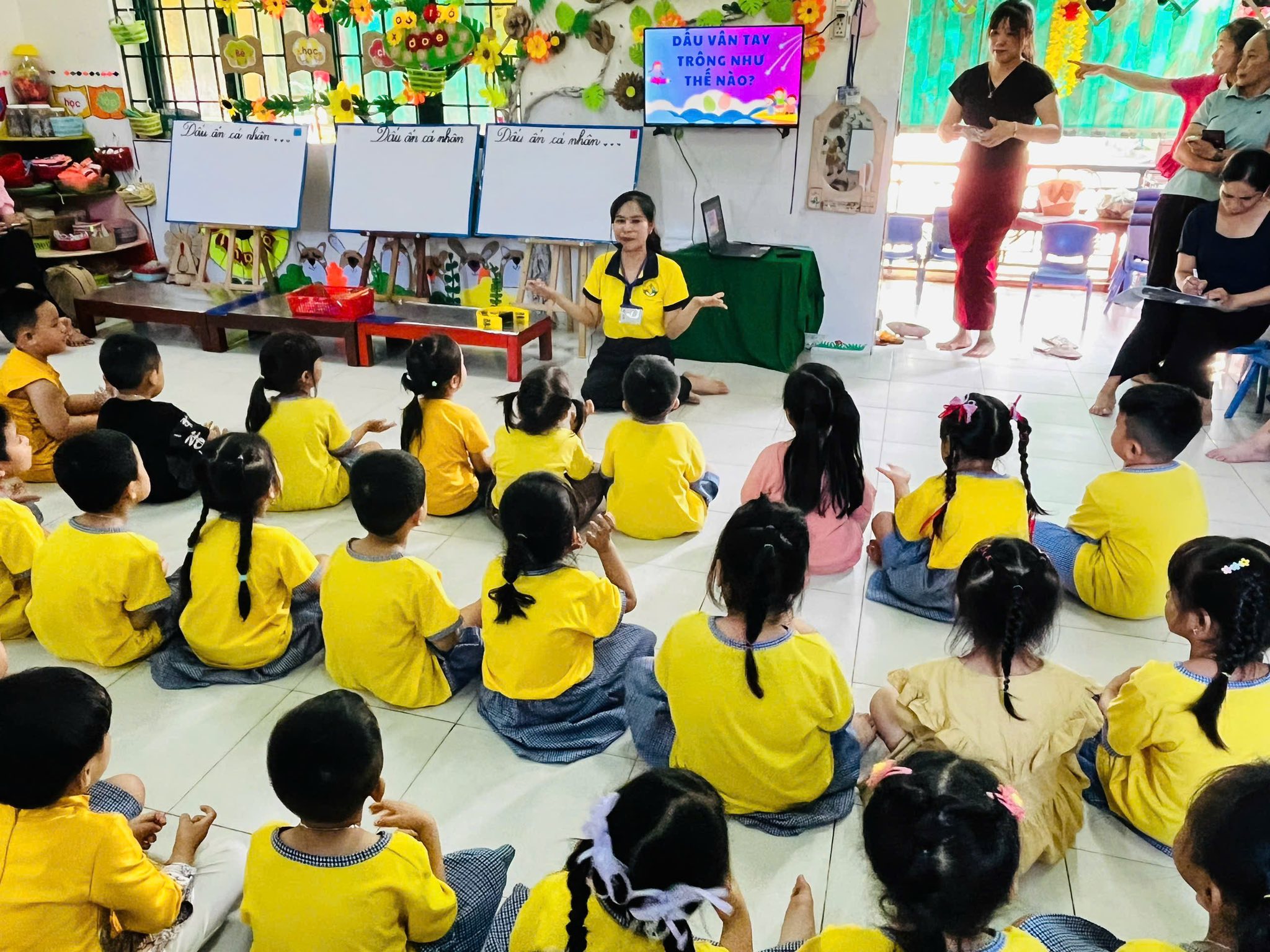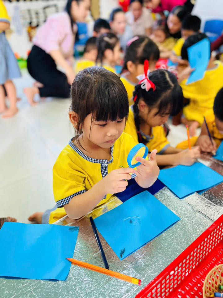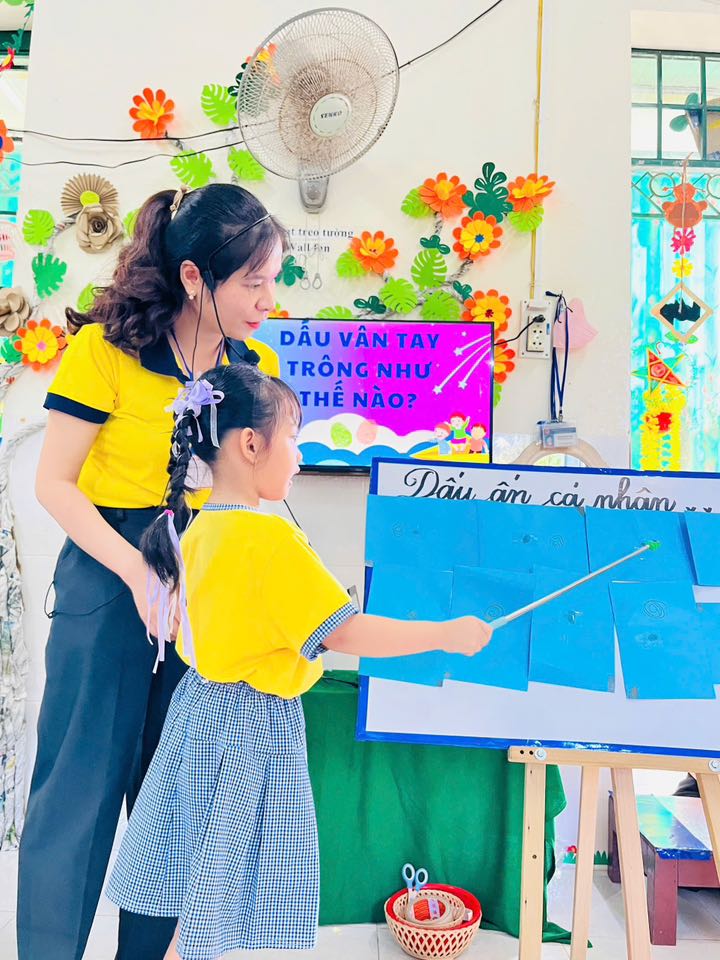 Lớp Lá D với hoạt động “Dấu vân tay trông như thế nào?” – giúp trẻ khám phá đặc điểm cơ thể, nhận biết sự khác nhau giữa các dấu vân tay, rèn luyện kỹ năng quan sát và tư duy khoa học.